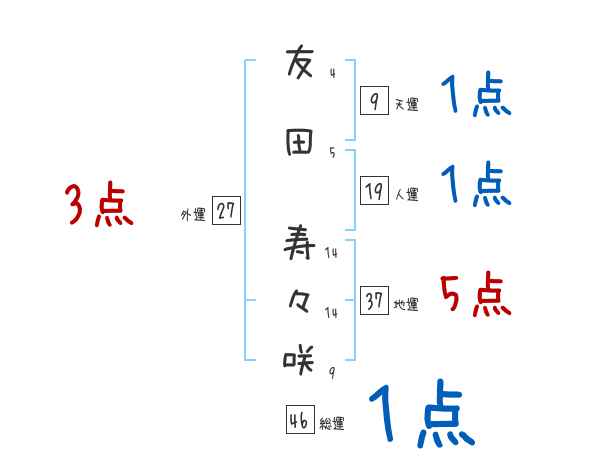 天運![]() | 友田寿々咲さんの天運は9画の1つ星!消極的で才能を発揮することが苦手なことも。周りの意見に耳を傾けましょう。 家系が持つ宿命的な運勢を表します。祖先から受け継いだ苗字ですので自分の力が及びません。家柄を象徴します。 |