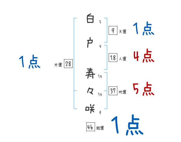 天運![]() | 白戸寿々咲さんの天運は9画の1つ星!消極的で才能を発揮することが苦手なことも。周りの意見に耳を傾けましょう。 家系が持つ宿命的な運勢を表します。祖先から受け継いだ苗字ですので自分の力が及びません。家柄を象徴します。 |