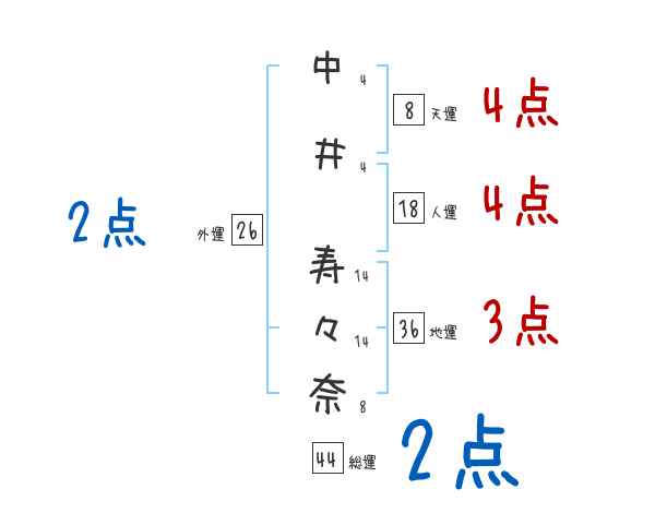 総運![]() | 中井寿々奈さんの総運は44画の2つ星!誠実で慎重な性格。物事を考えすぎないように注意しましょう。 あなたの人生を表す1番重要な運勢です。生涯を通じて影響する総合運となり、主に50歳以降の晩年期に影響を及ぼします。 |