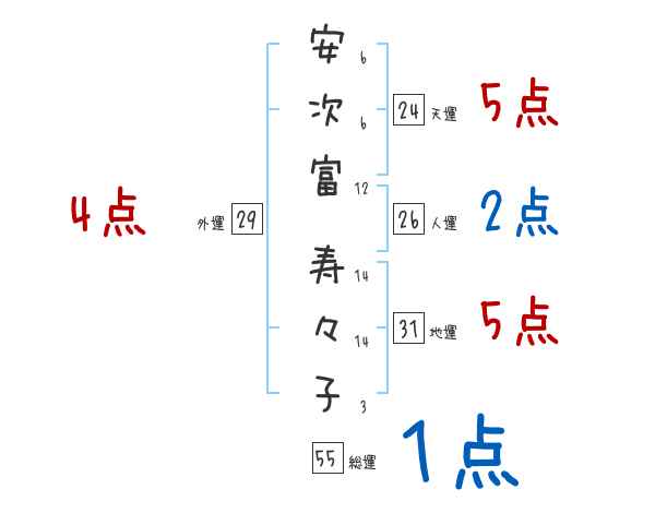 天運![]() | 安次富寿々子さんの天運は24画の5つ星!家庭運が良く順調な人生。金運にも恵まれる。 家系が持つ宿命的な運勢を表します。祖先から受け継いだ苗字ですので自分の力が及びません。家柄を象徴します。 |