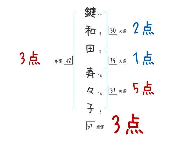 天運![]() | 鍵和田寿々子さんの天運は30画の2つ星!浮き沈みの激しさに注意しましょう。 家系が持つ宿命的な運勢を表します。祖先から受け継いだ苗字ですので自分の力が及びません。家柄を象徴します。 |