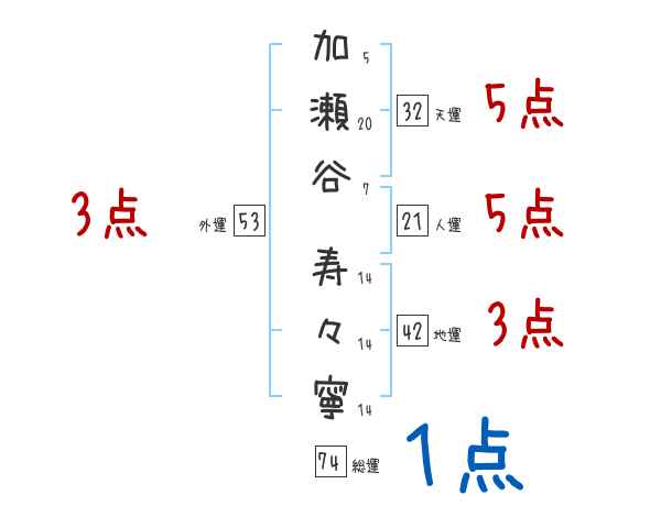 天運![]() | 加瀬谷寿々寧さんの天運は32画の5つ星!柔軟性があり成功する。チャンスが多く金運が良い。 家系が持つ宿命的な運勢を表します。祖先から受け継いだ苗字ですので自分の力が及びません。家柄を象徴します。 |