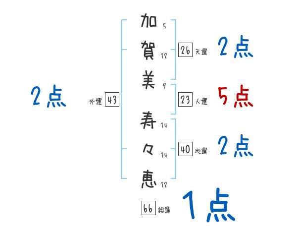 天運![]() | 加賀美寿々恵さんの天運は26画の2つ星!波瀾万丈かも。信頼できる人を大事にしましょう。 家系が持つ宿命的な運勢を表します。祖先から受け継いだ苗字ですので自分の力が及びません。家柄を象徴します。 |