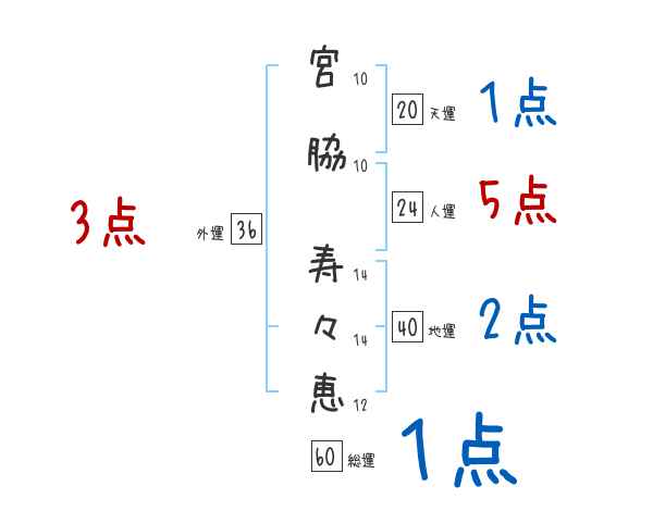 外運![]() | 宮脇寿々恵さんの外運は36画の3つ星!先見性が豊かです。多少神経質で苦労することも。 生活面を象徴する運勢です。外部から受ける影響力を表し、結婚運、家庭運や職場、環境への順応性を表します。 |