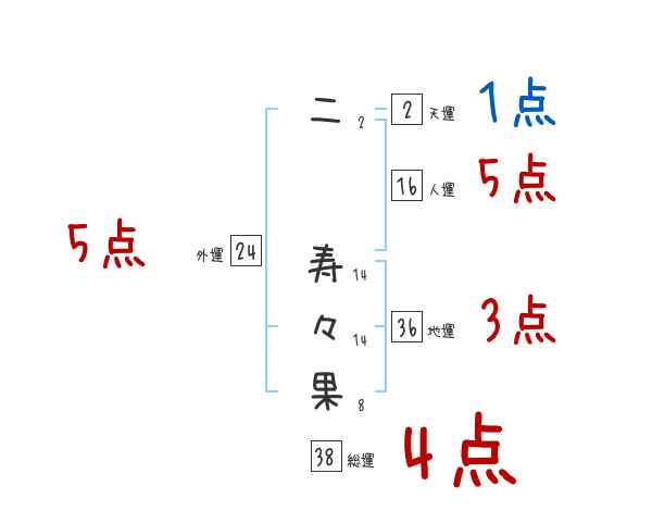 外運![]() | 二寿々果さんの外運は24画の5つ星!家庭運が良く順調な人生。金運にも恵まれる。 生活面を象徴する運勢です。外部から受ける影響力を表し、結婚運、家庭運や職場、環境への順応性を表します。 |