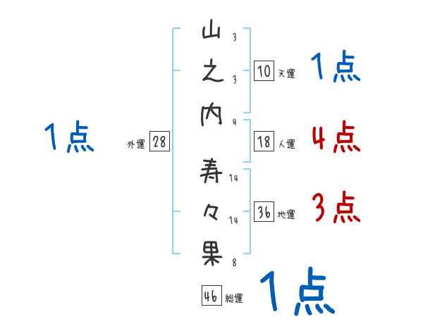 天運![]() | 山之内寿々果さんの天運は10画の1つ星!不安を感じやすい傾向。ストレスを抱えないように注意しましょう。 家系が持つ宿命的な運勢を表します。祖先から受け継いだ苗字ですので自分の力が及びません。家柄を象徴します。 |