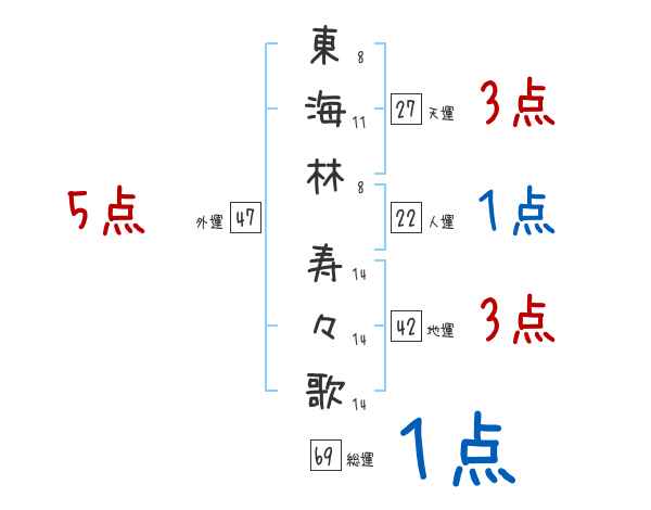 外運![]() | 東海林寿々歌さんの外運は47画の5つ星!実力が開花し発展する円満な人生。財に恵まれる。 生活面を象徴する運勢です。外部から受ける影響力を表し、結婚運、家庭運や職場、環境への順応性を表します。 |