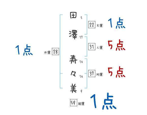 総運![]() | 田澤寿々美さんの総運は59画の1つ星!意志の弱さであきらめることが多いかも。粘り強さが必要。 あなたの人生を表す1番重要な運勢です。生涯を通じて影響する総合運となり、主に50歳以降の晩年期に影響を及ぼします。 |