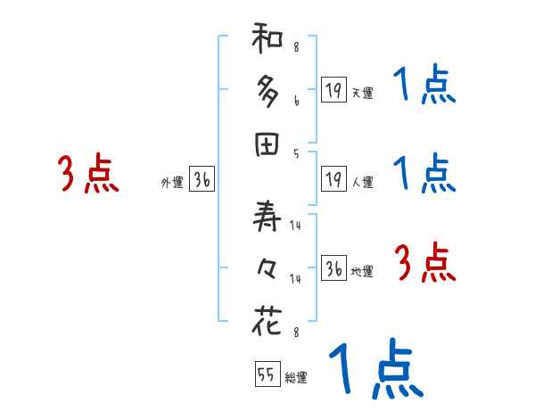 天運![]() | 和多田寿々花さんの天運は19画の1つ星!優れた才能を持ちますが、協調性が足りないことも。周りの人と協力する事を意識しましょう。 家系が持つ宿命的な運勢を表します。祖先から受け継いだ苗字ですので自分の力が及びません。家柄を象徴します。 |