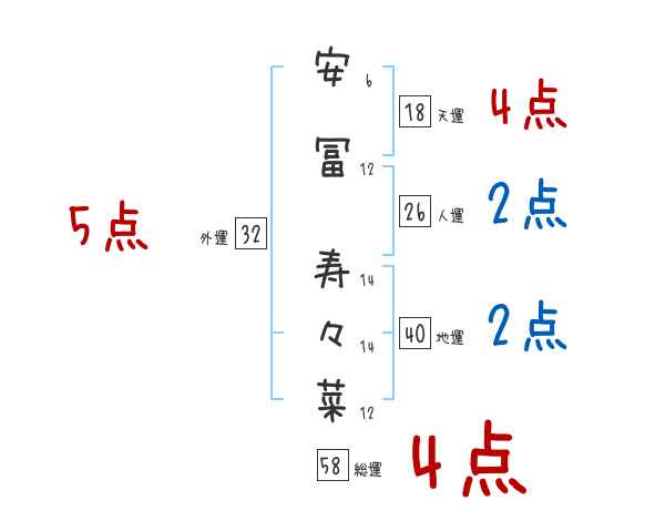 外運![]() | 安冨寿々菜さんの外運は32画の5つ星!柔軟性があり成功する。チャンスが多く金運が良い。 生活面を象徴する運勢です。外部から受ける影響力を表し、結婚運、家庭運や職場、環境への順応性を表します。 |