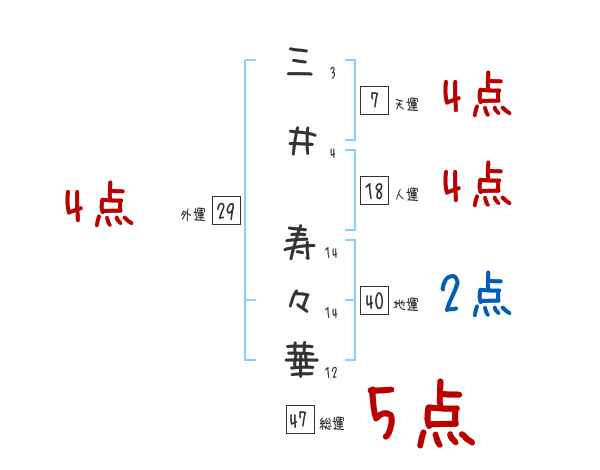 総運![]() | 三井寿々華さんの総運は47画の5つ星!実力が開花し発展する円満な人生。財に恵まれる。 あなたの人生を表す1番重要な運勢です。生涯を通じて影響する総合運となり、主に50歳以降の晩年期に影響を及ぼします。 |