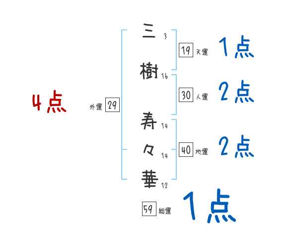 外運![]() | 三樹寿々華さんの外運は29画の4つ星!完全主義で才能がある。厳格な心の持ち主。 生活面を象徴する運勢です。外部から受ける影響力を表し、結婚運、家庭運や職場、環境への順応性を表します。 |