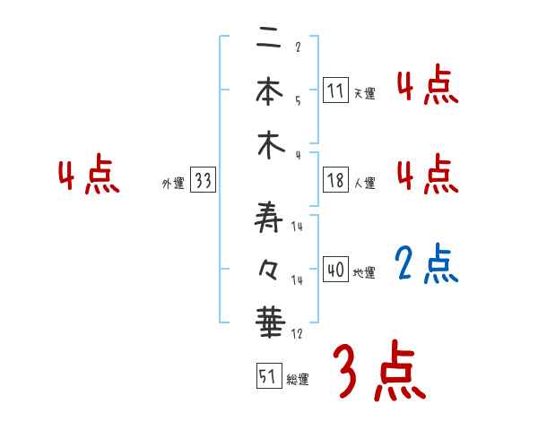 人運![]() | 二本木寿々華さんの人運は18画の4つ星!情熱的で剛気。忍耐力があり信頼される。 性格や才能などを表す2番目に重要な運勢です。人間関係や協調性、社会的な成功に影響します。主に20歳から50歳ぐらいまでの中年期の運勢を表します。 |