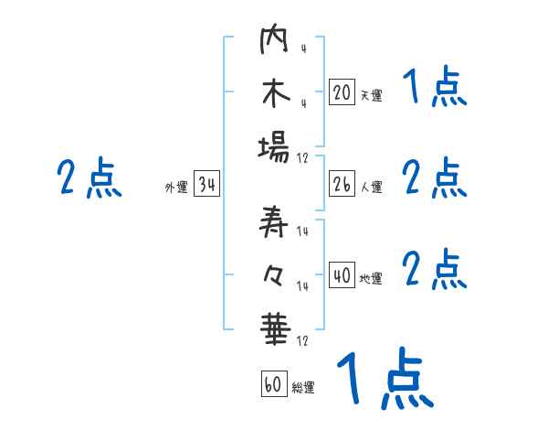 外運![]() | 内木場寿々華さんの外運は34画の2つ星!独創性に優れるが、自尊心が強く災難に注意しましょう。 生活面を象徴する運勢です。外部から受ける影響力を表し、結婚運、家庭運や職場、環境への順応性を表します。 |