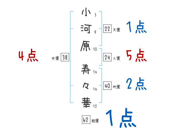 天運![]() | 小河原寿々華さんの天運は22画の1つ星!努力することが苦手ないっぽう手先が器用。芸術性にも優れる。 家系が持つ宿命的な運勢を表します。祖先から受け継いだ苗字ですので自分の力が及びません。家柄を象徴します。 |