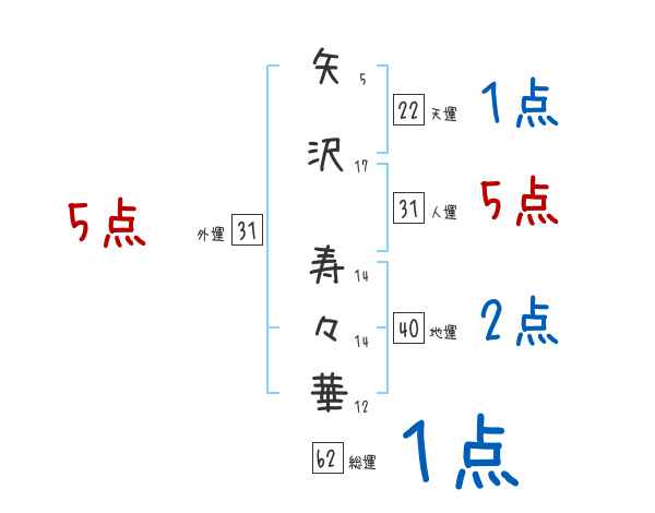 天運![]() | 矢沢寿々華さんの天運は22画の1つ星!努力することが苦手ないっぽう手先が器用。芸術性にも優れる。 家系が持つ宿命的な運勢を表します。祖先から受け継いだ苗字ですので自分の力が及びません。家柄を象徴します。 |