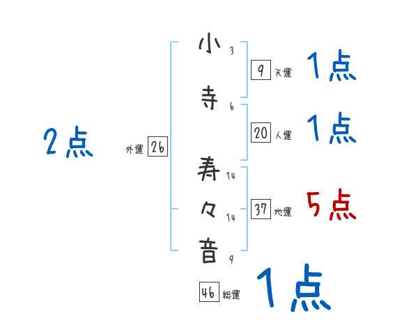 外運![]() | 小寺寿々音さんの外運は26画の2つ星!波瀾万丈かも。信頼できる人を大事にしましょう。 生活面を象徴する運勢です。外部から受ける影響力を表し、結婚運、家庭運や職場、環境への順応性を表します。 |