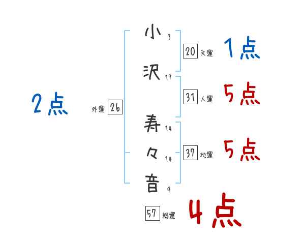 外運![]() | 小沢寿々音さんの外運は26画の2つ星!波瀾万丈かも。信頼できる人を大事にしましょう。 生活面を象徴する運勢です。外部から受ける影響力を表し、結婚運、家庭運や職場、環境への順応性を表します。 |