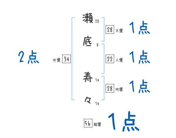 天運![]() | 瀬底寿々さんの天運は28画の1つ星!家庭環境に注意。スポーツで活躍できる能力があるかも。 家系が持つ宿命的な運勢を表します。祖先から受け継いだ苗字ですので自分の力が及びません。家柄を象徴します。 |