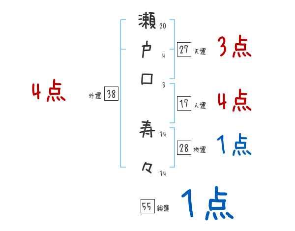 天運![]() | 瀬戸口寿々さんの天運は27画の3つ星!頭脳明晰だが強情で摩擦が多い傾向。孤立に注意。 家系が持つ宿命的な運勢を表します。祖先から受け継いだ苗字ですので自分の力が及びません。家柄を象徴します。 |