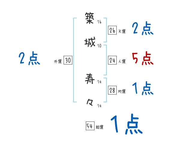 天運![]() | 築城寿々さんの天運は26画の2つ星!波瀾万丈かも。信頼できる人を大事にしましょう。 家系が持つ宿命的な運勢を表します。祖先から受け継いだ苗字ですので自分の力が及びません。家柄を象徴します。 |