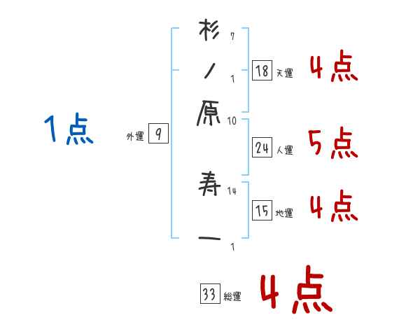 天運![]() | 杉ノ原寿一さんの天運は18画の4つ星!情熱的で剛気。忍耐力があり信頼される。 家系が持つ宿命的な運勢を表します。祖先から受け継いだ苗字ですので自分の力が及びません。家柄を象徴します。 |