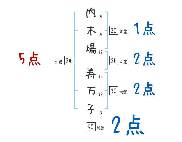 外運![]() | 内木場寿万子さんの外運は24画の5つ星!家庭運が良く順調な人生。金運にも恵まれる。 生活面を象徴する運勢です。外部から受ける影響力を表し、結婚運、家庭運や職場、環境への順応性を表します。 |
