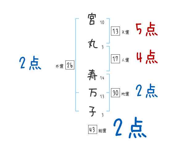 総運![]() | 宮丸寿万子さんの総運は43画の2つ星!頑固な性格で独立心が強いかも。やや非現実的で浪費に注意しましょう。 あなたの人生を表す1番重要な運勢です。生涯を通じて影響する総合運となり、主に50歳以降の晩年期に影響を及ぼします。 |
