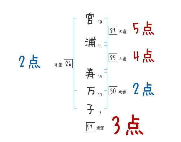 外運![]() | 宮浦寿万子さんの外運は26画の2つ星!波瀾万丈かも。信頼できる人を大事にしましょう。 生活面を象徴する運勢です。外部から受ける影響力を表し、結婚運、家庭運や職場、環境への順応性を表します。 |