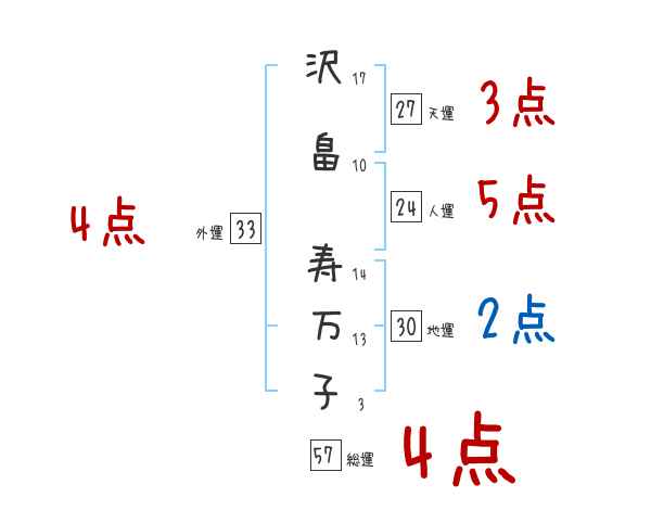 総運![]() | 沢畠寿万子さんの総運は57画の4つ星!向上心があり人望がある。地位を得る。 あなたの人生を表す1番重要な運勢です。生涯を通じて影響する総合運となり、主に50歳以降の晩年期に影響を及ぼします。 |