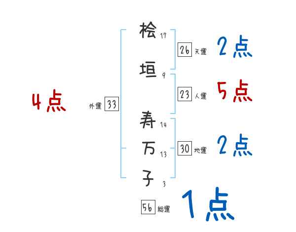 外運![]() | 桧垣寿万子さんの外運は33画の4つ星!権力志向でプライドが高い。勇気があり運を切り開き成功する。 生活面を象徴する運勢です。外部から受ける影響力を表し、結婚運、家庭運や職場、環境への順応性を表します。 |