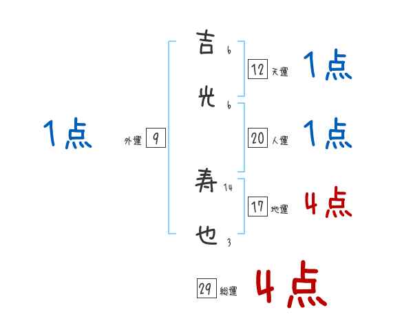 総運![]() | 吉光寿也さんの総運は29画の4つ星!完全主義で才能がある。厳格な心の持ち主。 あなたの人生を表す1番重要な運勢です。生涯を通じて影響する総合運となり、主に50歳以降の晩年期に影響を及ぼします。 |
