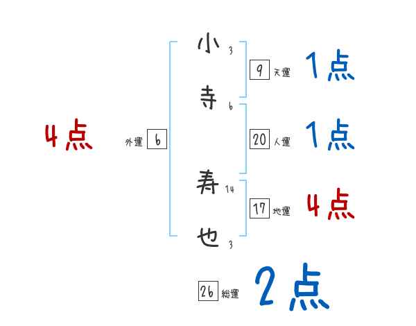 総運![]() | 小寺寿也さんの総運は26画の2つ星!波瀾万丈かも。信頼できる人を大事にしましょう。 あなたの人生を表す1番重要な運勢です。生涯を通じて影響する総合運となり、主に50歳以降の晩年期に影響を及ぼします。 |