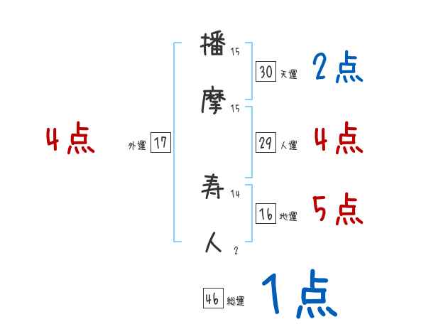天運![]() | 播摩寿人さんの天運は30画の2つ星!浮き沈みの激しさに注意しましょう。 家系が持つ宿命的な運勢を表します。祖先から受け継いだ苗字ですので自分の力が及びません。家柄を象徴します。 |