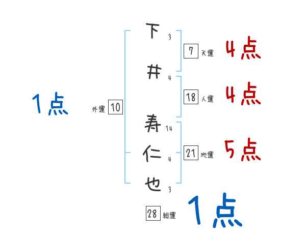 総運![]() | 下井寿仁也さんの総運は28画の1つ星!家庭環境に注意。スポーツで活躍できる能力があるかも。 あなたの人生を表す1番重要な運勢です。生涯を通じて影響する総合運となり、主に50歳以降の晩年期に影響を及ぼします。 |