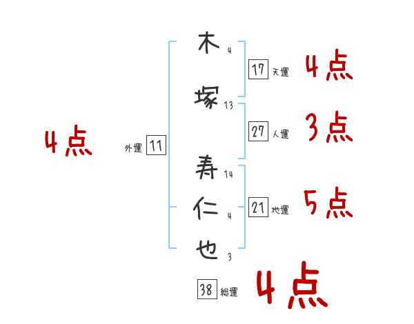 天運![]() | 木塚寿仁也さんの天運は17画の4つ星!積極的な行動力。地位を気づき財産を手に入れる。純粋な心と直感力。 家系が持つ宿命的な運勢を表します。祖先から受け継いだ苗字ですので自分の力が及びません。家柄を象徴します。 |