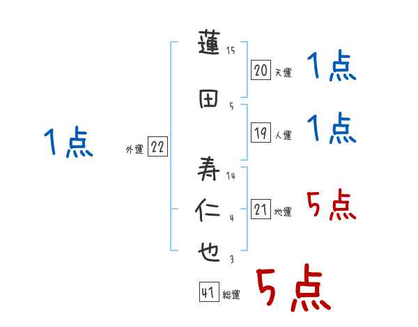 総運![]() | 蓮田寿仁也さんの総運は41画の5つ星!大志を抱き、目標に向かって実力を発揮し達成する。温和な性格。 あなたの人生を表す1番重要な運勢です。生涯を通じて影響する総合運となり、主に50歳以降の晩年期に影響を及ぼします。 |