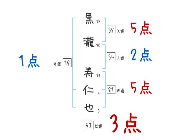 天運![]() | 黒瀧寿仁也さんの天運は32画の5つ星!柔軟性があり成功する。チャンスが多く金運が良い。 家系が持つ宿命的な運勢を表します。祖先から受け継いだ苗字ですので自分の力が及びません。家柄を象徴します。 |