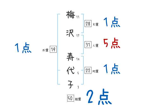 | 天運  | 梅沢寿代子さんの天運は28画の1つ星!家庭環境に注意。スポーツで活躍できる能力があるかも。家系が持つ宿命的な運勢を表します。祖先から受け継いだ苗字ですので自分の力が及びません。家柄を象徴します。 |