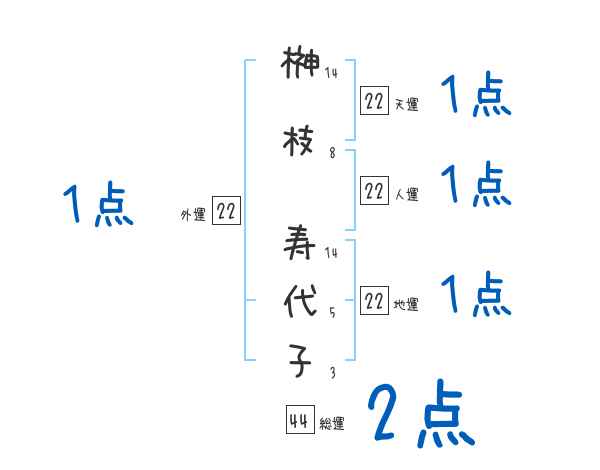 天運![]() | 榊枝寿代子さんの天運は22画の1つ星!努力することが苦手ないっぽう手先が器用。芸術性にも優れる。 家系が持つ宿命的な運勢を表します。祖先から受け継いだ苗字ですので自分の力が及びません。家柄を象徴します。 |