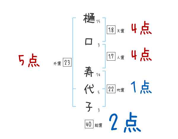 天運![]() | 樋口寿代子さんの天運は18画の4つ星!情熱的で剛気。忍耐力があり信頼される。 家系が持つ宿命的な運勢を表します。祖先から受け継いだ苗字ですので自分の力が及びません。家柄を象徴します。 |