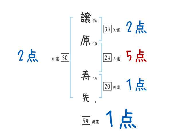 天運![]() | 譲原寿先さんの天運は34画の2つ星!独創性に優れるが、自尊心が強く災難に注意しましょう。 家系が持つ宿命的な運勢を表します。祖先から受け継いだ苗字ですので自分の力が及びません。家柄を象徴します。 |
