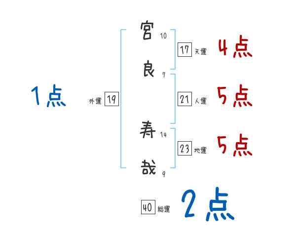 人運![]() | 宮良寿哉さんの人運は21画の5つ星!統率力がある。独立し成功する。名誉を手に入れる。 性格や才能などを表す2番目に重要な運勢です。人間関係や協調性、社会的な成功に影響します。主に20歳から50歳ぐらいまでの中年期の運勢を表します。 |