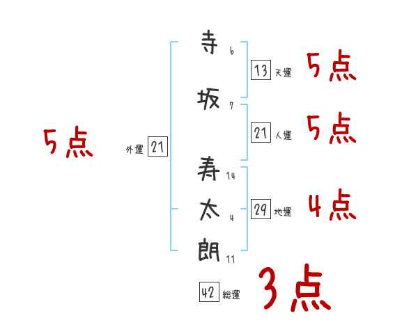 外運![]() | 寺坂寿太朗さんの外運は21画の5つ星!統率力がある。独立し成功する。名誉を手に入れる。 生活面を象徴する運勢です。外部から受ける影響力を表し、結婚運、家庭運や職場、環境への順応性を表します。 |