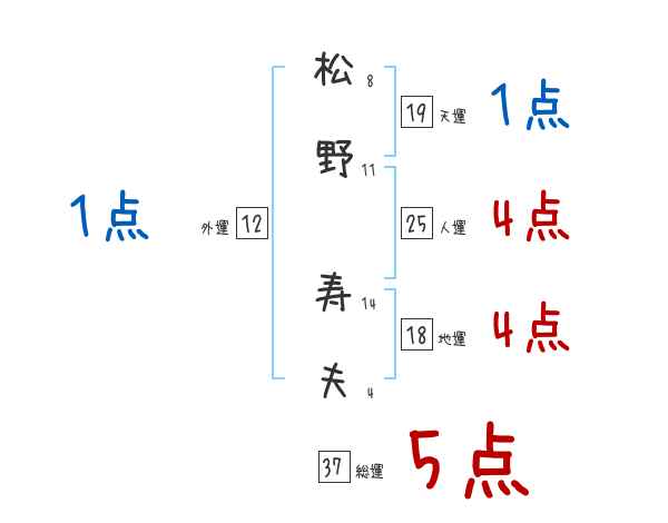 天運![]() | 松野寿夫さんの天運は19画の1つ星!優れた才能を持ちますが、協調性が足りないことも。周りの人と協力する事を意識しましょう。 家系が持つ宿命的な運勢を表します。祖先から受け継いだ苗字ですので自分の力が及びません。家柄を象徴します。 |