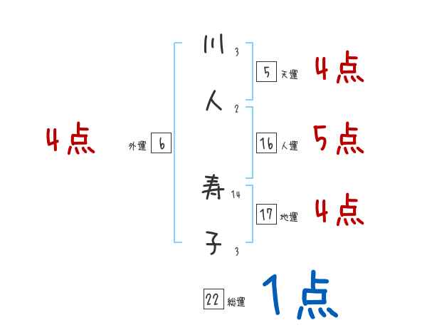 天運![]() | 川人寿子さんの天運は5画の4つ星!健康で安泰。協調性に優れ、財産に恵まれる。 家系が持つ宿命的な運勢を表します。祖先から受け継いだ苗字ですので自分の力が及びません。家柄を象徴します。 |