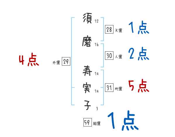 天運![]() | 須磨寿実子さんの天運は28画の1つ星!家庭環境に注意。スポーツで活躍できる能力があるかも。 家系が持つ宿命的な運勢を表します。祖先から受け継いだ苗字ですので自分の力が及びません。家柄を象徴します。 |