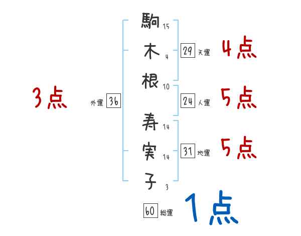 総運![]() | 駒木根寿実子さんの総運は60画の1つ星!悲観的で迷いやすい。波乱が多く損をしないように。 あなたの人生を表す1番重要な運勢です。生涯を通じて影響する総合運となり、主に50歳以降の晩年期に影響を及ぼします。 |