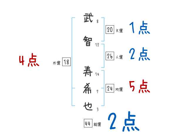 総運![]() | 武智寿希也さんの総運は44画の2つ星!誠実で慎重な性格。物事を考えすぎないように注意しましょう。 あなたの人生を表す1番重要な運勢です。生涯を通じて影響する総合運となり、主に50歳以降の晩年期に影響を及ぼします。 |