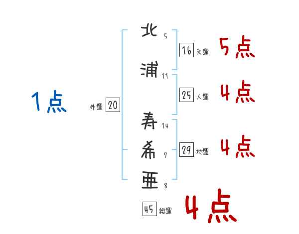 天運![]() | 北浦寿希亜さんの天運は16画の5つ星!人望が厚く大きく発展する。逆転成功が見える。 家系が持つ宿命的な運勢を表します。祖先から受け継いだ苗字ですので自分の力が及びません。家柄を象徴します。 |